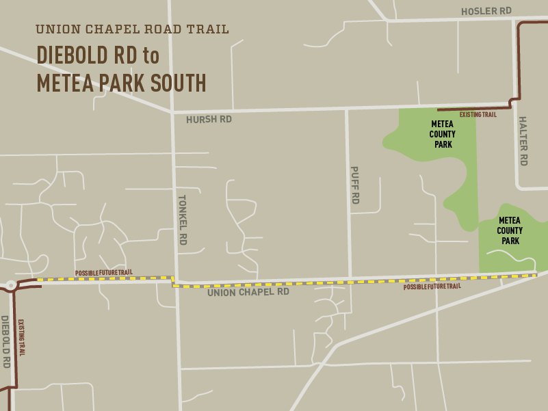 The ultimate vision is a trail in northcentral Allen county that will connect the existing trail network to the southern entrance of Metea County Park. Located near Leo-Cedarville, Metea Park is a 250 acre park that is home to the 120 acre Meno-aki State Nature Preserve. This park is one of the largest and most tranquil in our area! It features over 5 miles of hiking trails, woodlands, wetlands, picnic shelters, and a 1.5 acre lake with a swimming beach!