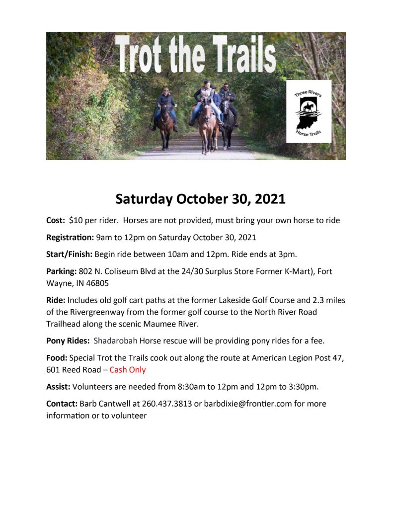Read MoreFort Wayne, Ind. – The City of Fort Wayne, Three Rivers Horse Trails, Inc. and Allen County are partnering for a third Trot the Trails horse trail ride on Saturday, October 30. The ride will take place along golf cart paths at the former Lakeside Golf Course and will also include 2.3 miles of the…