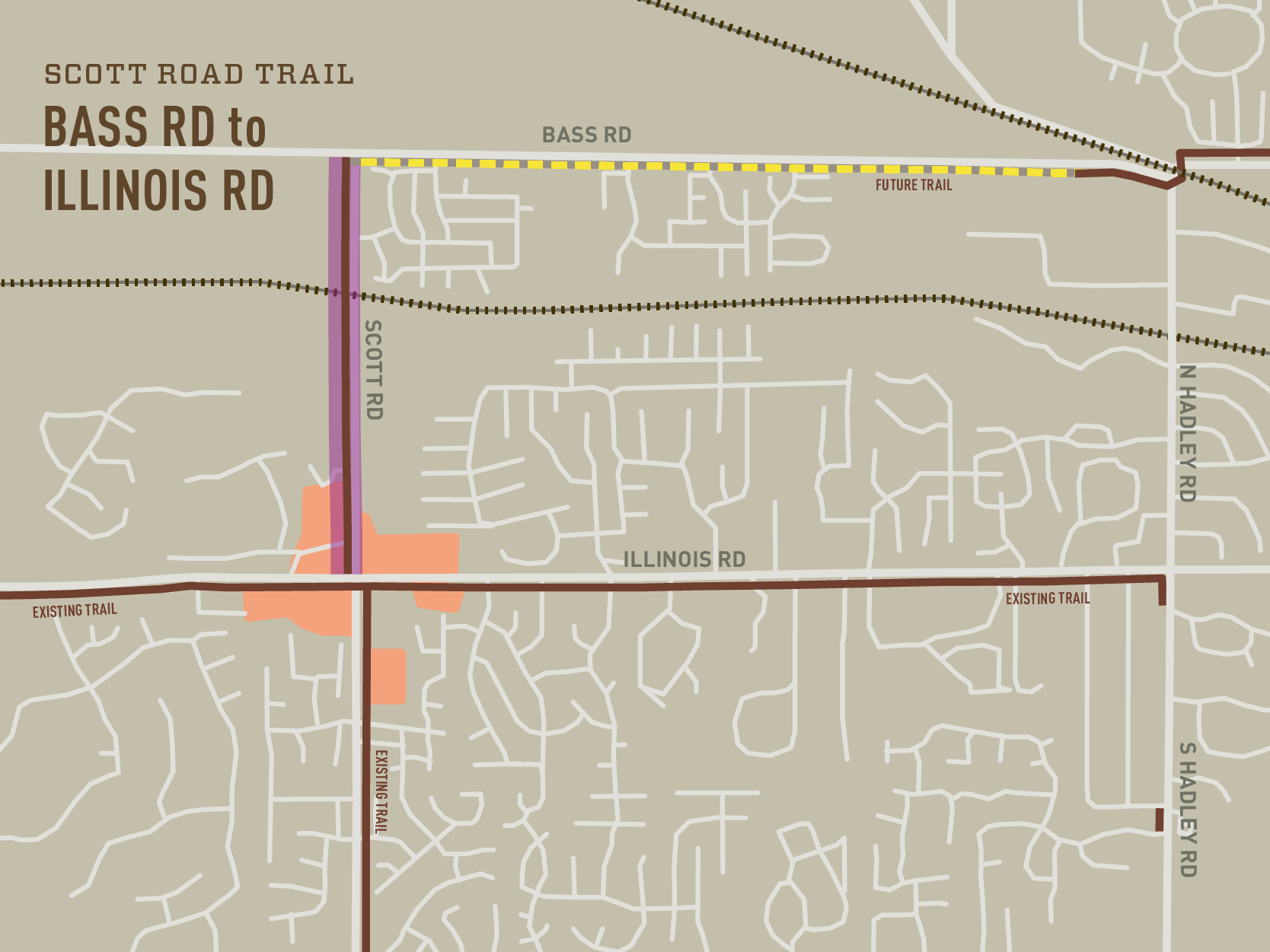 Trail on the west side of Scott Road from Bass Road to Illinois Rd/ State Route 14. Currently, the County is coordinating this project with the railroad. Trails right of way is planned to be acquired in 2024 with construction estimated to begin in 2025. Survey work is complete. The Highway Department is currently looking at grade separation options to put the trail over or under the railroad due to new design requirements by the railroad.