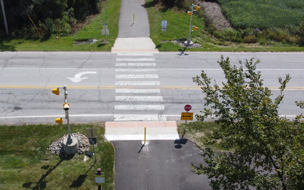 At crossings such as the mid-block crossings commonly found on the Pufferbelly Trail, trail users must stop when a stop sign is present and wait until the roadway is clear before crossing. Vehicles should NOT stop for trail users, and if they do, please kindly wave them on. During peak hours, this may require waiting a few minutes to cross. Use that time to enjoy a quick break, stretch, or take a sip of water—you’ll be safely on the other side in no time!